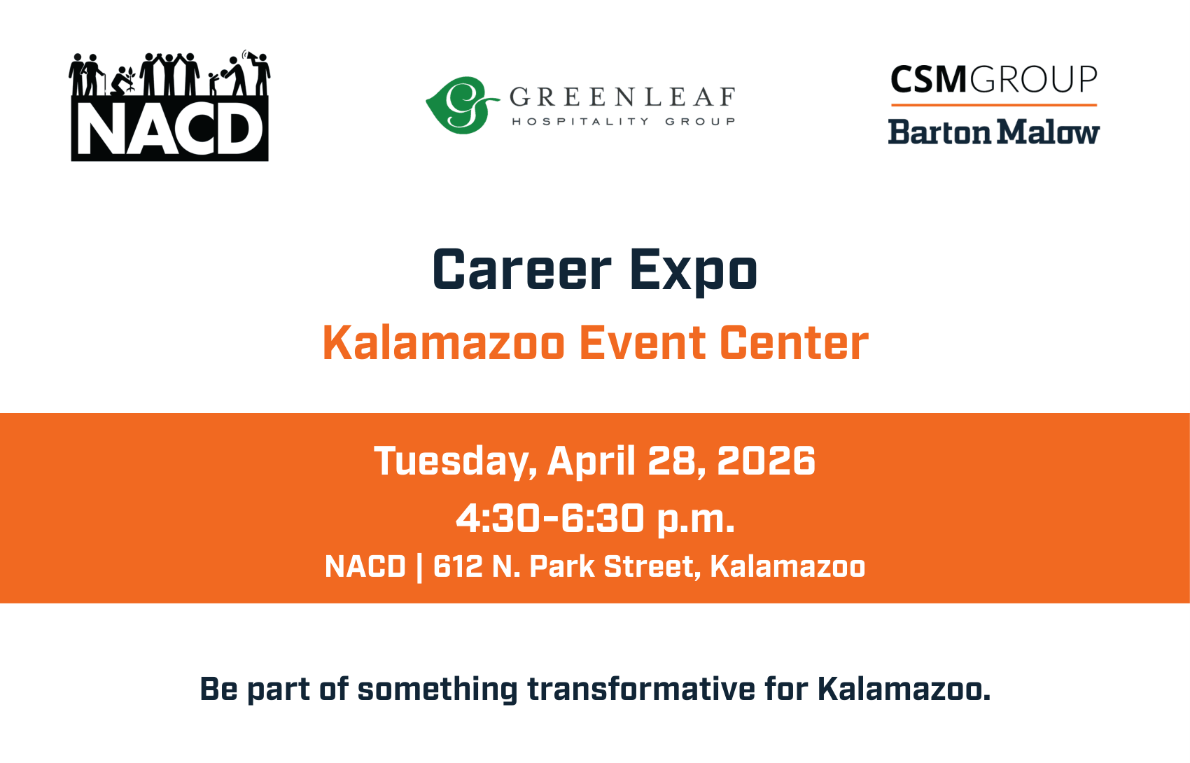 NACD will be hosting an Event Center Job Fair, connecting community members with employment opportunities tied to the upcoming Kalamazoo Event Center. Come ready to connect, ask questions, and take a step toward new opportunities. In partnership with Greenleaf Hospitality Group, CSM Group, and Barton Malow.